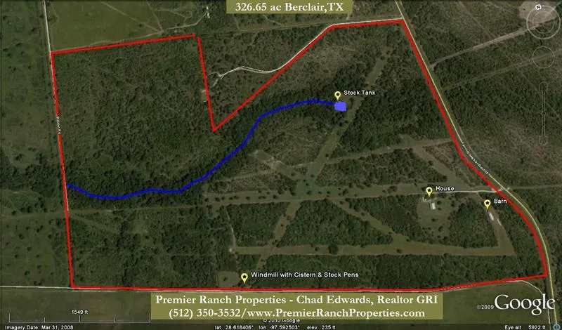The Lott Ranch consists of 326.65 acres of rolling terrain filled with native brush land of which includes an abundance of Majestic Live Oak trees and other native hardwoods. The vast majority of the ranch has been left completely unchanged to promote good game management for all species. The property has a quaint wet weather creek that flows West to East across the middle of the tract and makes for a nice stock tank. Currently the owner runs cattle on the entire tract for an agricultural tax exemption. In 2005 the Lott’s built the rock home in the Southeast quadrant of the ranch and included many upgrades throughout the house. Upgrades include but not limited too vaulted ceilings with stained wood beams, huge rock fireplace, stained concrete flooring, gourmet kitchen, spa-like master bath, huge front and back covered patios, low e double pane windows, extra strong slab foundation and metal roof. The metal barn was built the same year. There is a healthy population of whitetail deer, white-winged dove, quail, turkey, hog, bobcat and coyotes that inhabit The Lott Ranch. Big quite neighbors make for a peaceful setting and an away from everything feeling. Enjoy many beautiful sunsets as you peer towards the Western horizon in the evening time. There is road access from either the West side of the tract or the East. The Lott Ranch is located in Berclair, Texas (Goliad County).