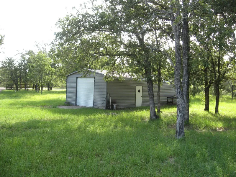 Land with a sewer system, water well and lots of Oak trees, are hard to find. Especially if 10 acres or less. This property has ONLY SEVEN (7) acres and is on a corner. Plus it has a metal barn with twin 12' roll-up doors, one on each end, and it is on a slab. It is 18' x 40' ft. The second metal building is 18' x 30' and in three setions, built as one building. All three sections are 10' x 18'. One is a dog run with dirt floor and three sides. The middle section is a drive through for a vehicle or tractor, also on dirt and is 10' x 18'. The third section is also a 10' x 18'. It has a concrete floor, running water and electricity. It is called the wash room and also has a water softner in it.