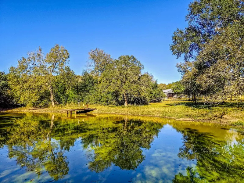 Pretty 38 acre tract - secluded and private. Perfect recreational property or family retreat. Dotted with live oaks in addition to mature post oaks, water oaks, and cedar elm as well as yaupon, mesquite and cedar - great cover for wildlife. The western boundary of this property is Pin Oak creek - a natural habitat for deer, hogs and other small game. Ten acres is in improved Jiggs Bermuda. The rolling terrain adds interest, and a native pecan orchard is located in the bottomland near the creek. Pond is walking distance from the house and is stocked with bass. The attractive 3 bedroom house has recently been remodeled with a down-to-the-studs renovation - water lines replaced with PEX lines and electrical upgraded; new windows, Hardiplank siding, new metal roof. Flooring is vinyl plank for ease of care. The kitchen is bright with white cabinets, white subway tiles, and butcherblock count...