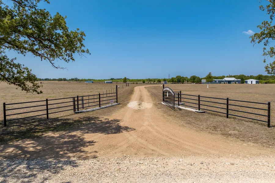 Gently sloping 46+ acre ranch nestled in-between San Antonio and Houston off IH10 offers ideal terrain with fenced and cross fenced pastures, a manufactured main house with permanent addition containing 3 spacious bedrooms, 3 baths, 1 half bath, formal living, family room, open-air garage and attached work shed/shop. Two metal barns with tack room and dog kennel perfect for equipment or animal storage. Currently ag exempt with pens, fenced orchard, kitchen garden and more! It is the perfectly sized country home or weekend escape with the perfect amount of character and charm. Small stock tank/pond. Well and aerobic septic system on-site. - 10/12/2022 1:00:27 PM
