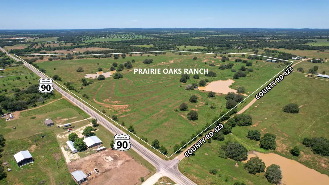 Prairie Oaks Ranch is a private and tranquil multi use property that consists of 122.5 +/- Acres of rolling pasture land featuring scattered century Oaks and multiple large ponds throughout. This ranch is in a great location and possesses an adequate amount of road frontage along with community water. This allows the opportunity for future development into smaller ranchettes. The property also features a large, 5,600 sf open hay barn along with cattle working pens. There is approximately 3,746 feet of road frontage along Hwy 90 and 2,202 feet of road frontage on County Road 423. The ranch has multiple future build sites throughout the property. Aside from being a great cattle property, this ranch would make for an exceptional residential property, hunting, recreational or weekend retreat.