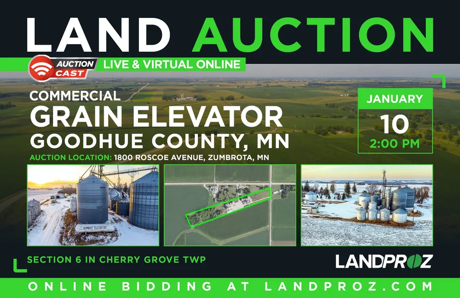 LandProz is pleased to present the Bombay Elevator in Goodhue County, MN. This commercial grain elevator will be offered to the public to bid their price via LandProz AuctionCast at our website and on-site at 1800 Roscoe Avenue in Zumbrota, MN.