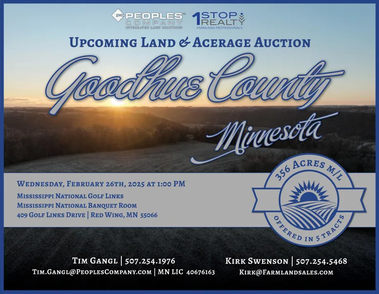 Mark your calendar for the Goodhue County, Minnesota, Land Auction on February, 26th, 2025. 1 Stop Realty together with Peoples Company is representing the Doris Halverson Trust and Scott & Mary Ellen Halverson in selling 356 m/l acres of tillable, pasture, and recreational land along with a home site, all to be divided into five tracts. This property is ideally situated just 15 minutes from Red Wing, MN, and 1 hour from either the Twin Cities or Rochester, Minnesota. It provides a blend of income potential, leisure activities, and seclusion while being easily accessible from Highway 61. This property is an excellent agricultural investment and recreational retreat.