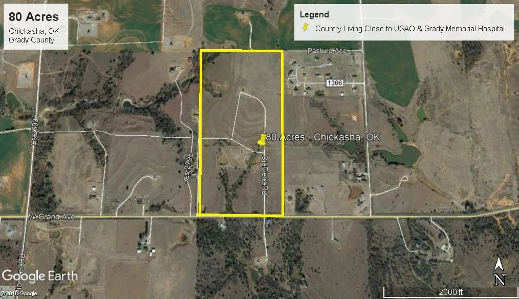 Located on West Grand Avenue in Chickasha, Oklahoma, this 80 acres has access to good paved roads and rural water. Only a few miles from the University of Science and Arts of Oklahoma and Grady Memorial Hospital, this property offers rural living close to town for those seeking country life, pasture for livestock and outdoor recreation.