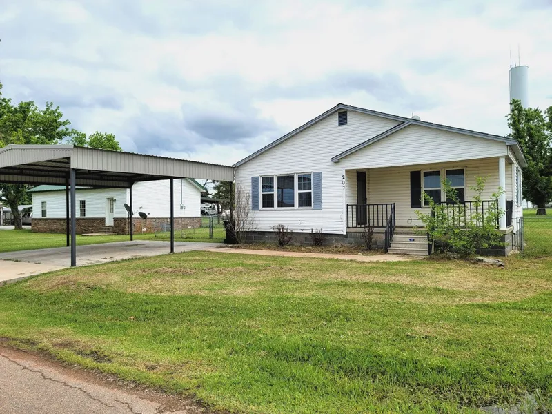 Cute home in Amber, OK.. Two bedrooms and two full baths. Includes a bonus room with a closet that could serve as a 3rd bedroom, dining room, etc. All appliances remain with the home including the stove, dishwasher and refrigerator. Great parking under a metal RV sized double carport on a concrete slab. Fenced in backyard.