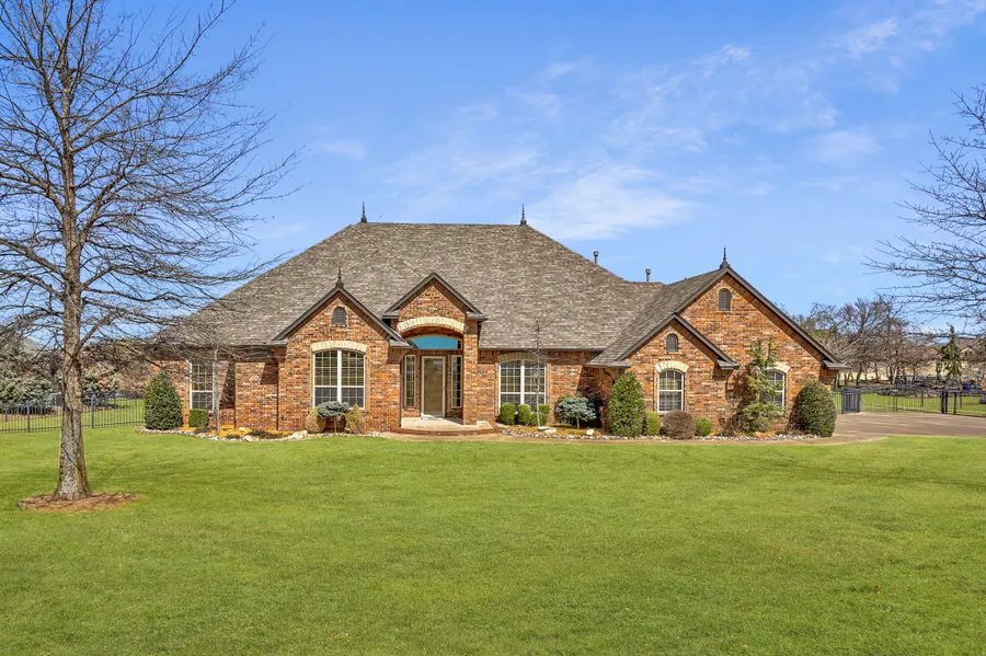 Sprawling suburban retreat with resort-style amenities in Tuttle Schools. Sitting on over one-and-a-half acres, this home offers spacious living with outdoor living & kitchen, saltwater pool, detached shop with 900 SF apartment, and gated drive. Entering the home, you'll find hardwood floors with rich wood trim, a living area with plantation shutters, statement stone fireplace with reclaimed wood mantle. Next you'll find an updated kitchen with granite counters, stainless steel appliances, custom cabinetry, and breakfast bar. Large master suite has tons of natural light and view of the lake. Attached ensuite has dual vanities, granite counters, soaker tub, and walk-in closet. Two Guest bedrooms share a Jack-and-Jill bathroom.Study is near kitchen but could be used as a 4th bedroom. Upstairs is a large bonus room and full media room with theater seating.The backyard is a dream with large ...