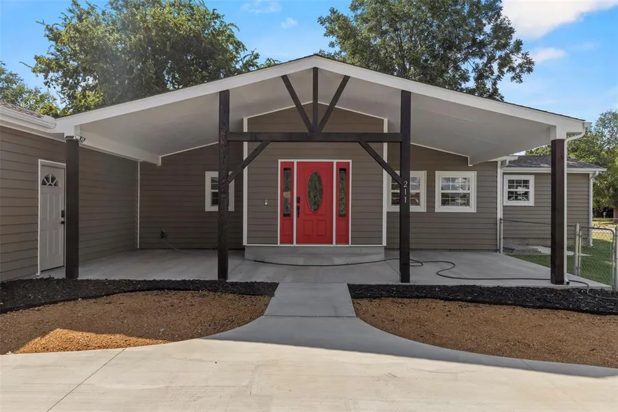 This home has been completely remodeled down to the studs, deemed a new build by appraisal! Added square footage makes for a roomy, open concept floor plan. Upon arrival, you are greeted by a large covered porch with vaulted ceiling, cedar posts and sunrise top making for a beautiful entrance. Entering there is a stunning crystal chandelier. An electric fireplace adds ambiance and comfort with multiple settings for color and heat. The mantel is a striking granite with chiseled edge. You will notice a beautiful light fixture with built-in fan. The statement lighting continues over the kitchen bar. The kitchen features porcelain tile, luxurious and durable granite countertops and all new stainless-steel appliances. Special features include a reverse osmosis for drinking water and tankless water heater. The utility room houses pantry and extra storage. The primary bedroom has a vaulted ceil...