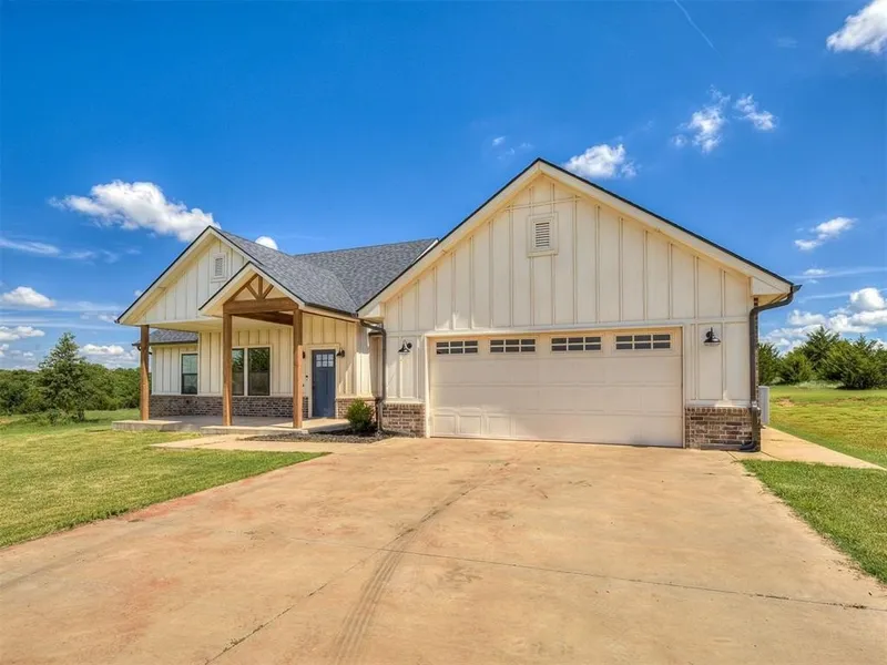 New price. Enjoy peaceful country living in this beautiful like new home built in 2020 on just over an acre in Blanchard. You're welcomed to the home by a lovely porch into the living room with wood grained tile that runs throughout a good portion of the house. Decorative masonry electric fireplace and exposed shelves decorate the living room. The kitchen design is amazing with a farmhouse glam including granite countertops, new dishwasher, and new microwave. You'll love the primary suite with spacious walk-in closets and a beautifully tiled shower. Storm shelter. New roof and siding and garage door. This beautiful home is nothing compared to the sunset view from the backyard and the deer friends you'll enjoy on this beautifully treed lot. Schedule a showing and come take it all in.