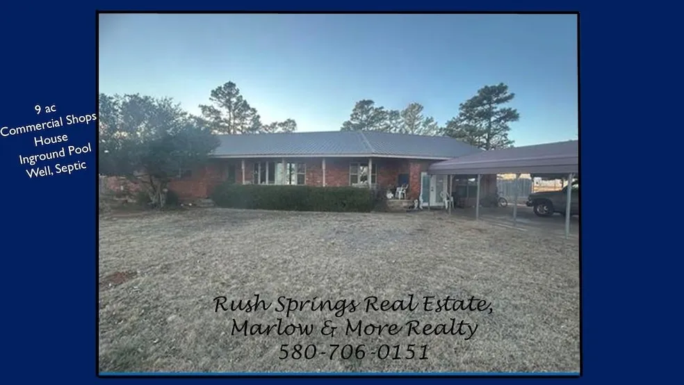 Business and home on the same 9-acre MOL a fantastic setup for family and income! Conventional or cash purchase have your lender ready. This family wants you to love the home as much as they have. Located just outside city limits, yet less than a half-mile to groceries, this is a great place to live and thrive. The current owners have built a wonderful life here, with easy access everywhere. Jump on the highway and head north, south, east, or west! Find the county seat of Chickasha or the Stephens County courthouse, just minutes from the mature trees surrounding the house. The ____ commercial building and the ____ sq ft MOL building have previously been used for mechanics, fabrication, and painting. What could it do for you? The cozy home features three bedrooms, two baths, a kitchen, living, and dining area, perfect for any family. Cool off in the summer with the inground pool or relax under one of the two awnings. The covered back porch overlooks the pool, as does the kitchen sink. Put your personal touch on this spacious, warm home. Want to do your own updates but need a starting point? This home offers that opportunity. Don't wait! Call Rush Springs Real Estate today for an appointment.