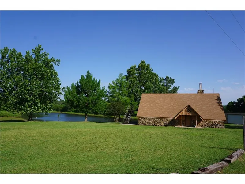 Fish in Your Own Backyard! Picturesque Rock Cabin in West Central Blanchard is the get-away you've been searching for! Tucked away at the end of a country lane this 5-acre property has a Private Pond stocked with bass, a variety of trees, garage/workshop, RV outbuilding and viewing deck/patio. Quaint cabin is designed for those who want to enjoy life in their own backyard. Many updates to the home include granite in the kitchen, fresh paint, travertine, marble & cedar accents in the main bathroom. Farmhouse kitchen has lots of counter space and white, raised panel cabinets. The large master bedroom is downstairs with a place for pellet stove fireplace. A spiral staircase leads to two upstairs bedrooms and a bath. There's a wet bar in living room--just needs plumbing work. Cottage-style dining/study area. Central vacuum and plenty of storage. Wood siding & deck need repair. Just a few more touches inside and this place will be a treasured retreat.