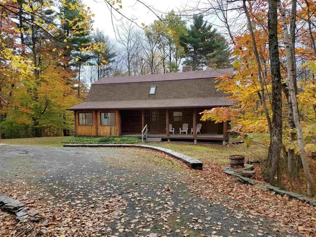 This rustic and contemporary style log home is awaiting it's new owners to enjoy the privacy afforded by the location and the 5.6 +/- acre lot. Enter through the farmers porch which offers great space for your rocking chairs. Once inside you will find a soaring ceiling with skylights over the living room, open concept kitchen/dining/living a half bath with laundry hookups and a private den located on the first floor. The living room has a fireplace and a woodstove hookup. Upstairs is a large primary bedroom, full bath and two more bedrooms. A catwalk on the second floor overlooks the living room area. The two car garage has full walkup overhead. Plenty of storage or convert to finished space for great getaway area. The enclosed porch overlooks the open back yard area enclosed by the woods.