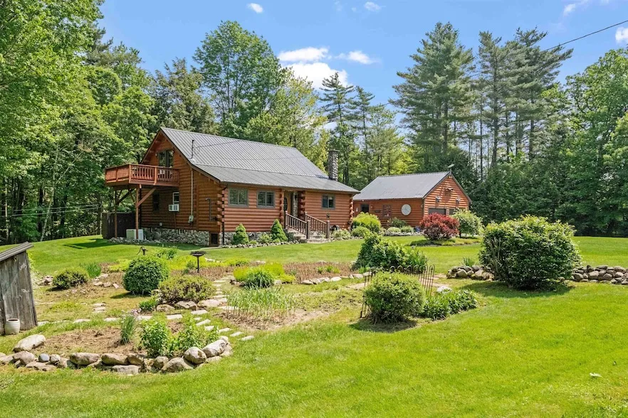 Welcome to 1219 County Road in Haverhill, NH! Nestled on 15 private acres, this immaculately maintained 3-bedroom, 2-bath custom log home blends modern farmhouse charm with timeless log cabin warmth. Crafted with exceptional care and fine craftsmanship, it offers comfort, character, and four seasons of recreation right outside your door. Inside, you'll find rich wood finishes, a smart and functional layout, and thoughtful updates throughout. The open-concept kitchen and dining area flows into a cozy living room anchored by a wood stove perfect for chilly New England nights. Step outside to a large deck for entertaining, unwind on the covered porch, or relax by the tranquil pond surrounded by mature landscaping, including perennial gardens, flowering trees, berry bushes, and evergreens that attract abundant wildlife. In addition to the oversized 2-car garage, the property features multiple outbuildings, a custom root cellar, and trails for exploring. With easy access to the Connecticut River and nearby outdoor adventures, this one-of-a-kind property is perfect as a year-round home, vacation retreat, or peaceful escape in the heart of the Upper Valley.