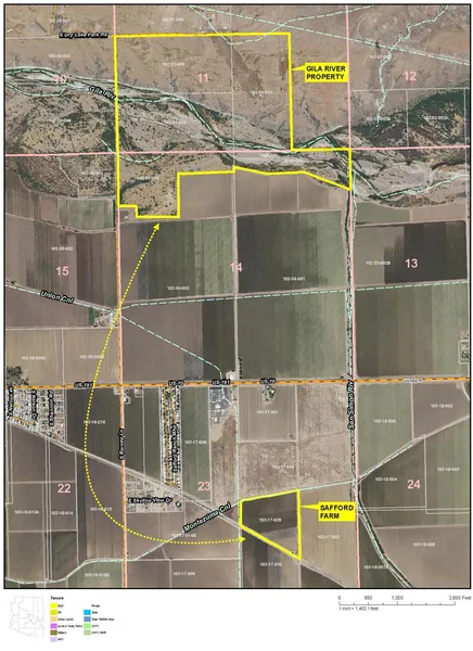 366.35 acres in two non-contiguous tracts, located two miles east of downtown Safford, southwest of the Safford Regional Airport and west of Solomon. APNs: 103-17-029, 102-31-004, 102-31-009, 102-31-010, 102-34-004, 102-34-006. The Gila River property is 332.76 acres southwest of the Safford Regional Airport, Saffords Dry Lake Park is just to the north with Dry Lake Road being the northern boundary. The Gila River property has one mile of Gila River bisecting it with riparian vegetation, the confluence of the San Simon River into the Gila River is on the eastern boundary. About 188 acres are undulating river bottom land, the balance of the Gila River property is uplands level mesa. The farm property is a non-contiguous 33.59 acre irrigated farm parcel. It sits about half a mile south of Highway 191, the northern boundary is the Montezuma Canal and the southern boundary is the Union Pacific Rail Road. Physical access is from dirt farm roads but the farm parcel does not have legal access. The farm property (103-17-029) has 29.60 acres of decreed water rights and 27.20 acres are being irrigated. It is in the Gila Valley Irrigation District and receives water from the San Jose Canal. The 2020 assessment rate for the San Jose Canal is $40.00 per decreed acre and is paid outside of the property tax bill directly to the district. Water delivery is 6 acre feet per irrigated acre per year.