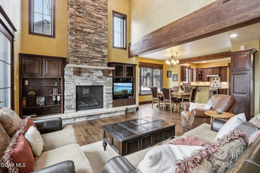 This thoughtfully laid out, furnished townhome offers refined mountain living with quality craftsmanship throughout. The open-concept great room features a dramatic two-story stone fireplace, custom built-ins, soaring ceilings, exposed wood beams, and rich hardwood floors, while large windows fill the space with natural light. The kitchen includes stainless steel appliances, granite countertops, custom cabinetry, and a breakfast bar flowing into the dining area. Multiple decks extend the living space outdoors. The home offers four spacious primary suites with custom showers and king-sized bedroom layouts. In-floor radiant heat, 8-foot alder doors, and a two-car garage add to this exceptional property.