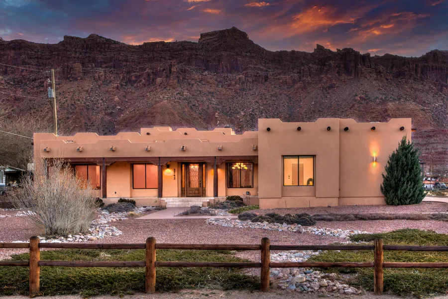 Elegant Single Family Home minutes from the center of town. Upon entering you are warmly greeted by Turkish Travertine Tile, and a bright and open floor plan. 3 bedrooms, 2.5 baths and an office. The great room boasts 12ft high ceilings, with hand peeled and carved vigas in a basket weave pattern from New Mexico. The door to the office is carved basket weave Mahogany from Brazil. Top-of-the-line appliances, GE Monogram. Meticulous attention to detail is presented in the kitchen with delicatus granite from Brazil. The kitchen leads you to the sunny inviting back patio. There is an awning for shade and a fountain that creates a relaxing atmosphere to sit and enjoy the iconic Moab Rim. The large laundry room has floor to ceiling closets and cabinets. All the closets have shelving. Master Bedroom has an extra large walk-in closet with full length built in cabinets.The in-ground swimming pool...