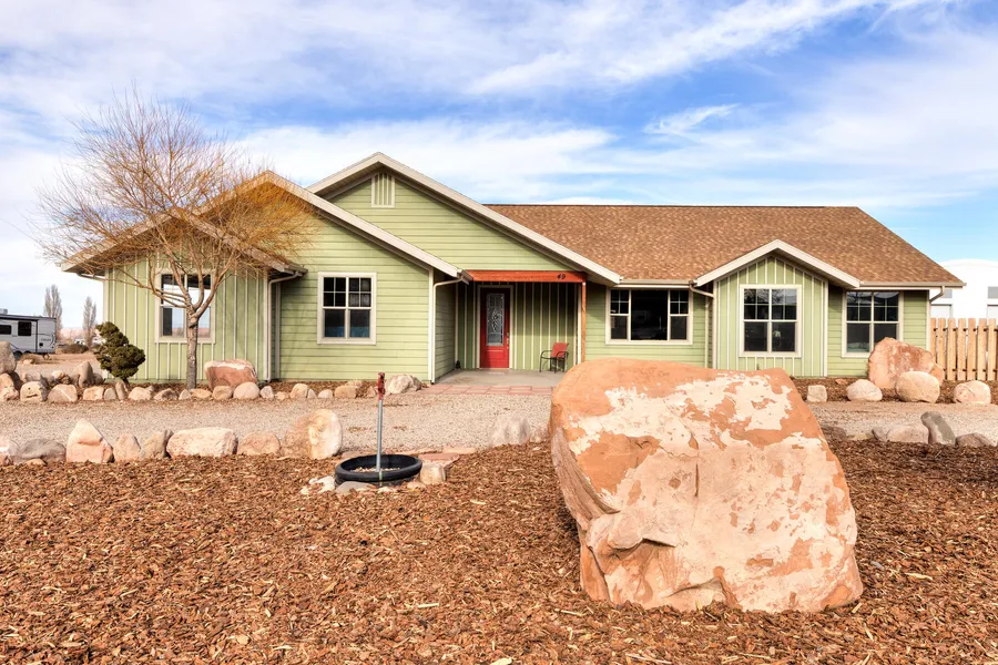 Charming residence situated on Ranch Road featuring three bedrooms and two bathrooms. This home boasts a spacious covered porch providing breathtaking views of the striking red rock surroundings. Additionally, it includes a two-car garage and a well-equipped storage shed with electrical, suitable for secure bicycle storage and a compact mechanic workspace. The backyard is adorned with delightful raised gardening boxes and lush landscaping. There is ample space for expanding your garden or constructing an accessory dwelling unit (ADU) or workshop.