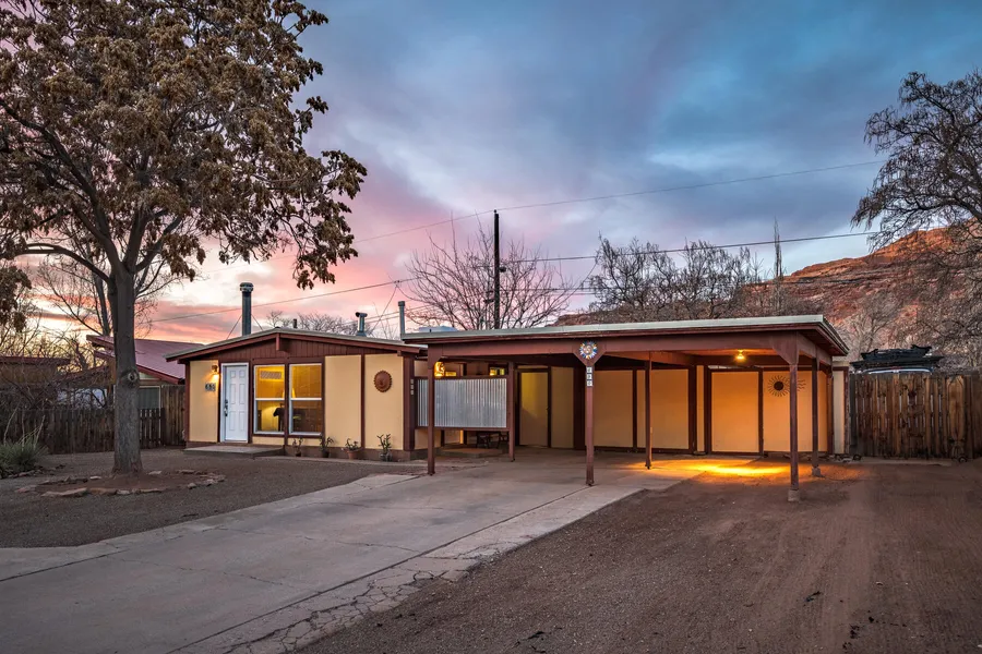 Charming mid-century modern residence located on the north end of Moab. Its prime location offers convenient proximity to attractions such as Arches National Park, bike paths, and parks. The meticulously updated interior offers modern conveniences with vintage charm. The property features ample parking alongside a heated garage equipped with a practical workbench and built-in shelving. For the convenience of the buyer, some furnishings and tools stay with the home.