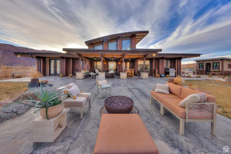 SKY RANCH- Your Moab and aviation dreams have merged with this sophisticated architectural marvel at Sky Ranch Estates with access to the private runway. Designed and finished with the classiest details with interior stacked stone feature walls, custom hardwood doors, elegant cabinetry, and elevated tongue and groove ceilings with gorgeous structural beams benefiting the unique clerestory windows that capture the mood of all hours of the day. The six-foot natural gas fireplace offers a focal point in the captivating grand living room with seamless flow to the formal dining and gourmet kitchen, all with French doors to both front and back patio living spaces. Your stunning kitchen will impress with the Dacor gas range complete with a convenient pot filler, a warming drawer, wall oven, and expertly designed butler's pantry. The main bedroom suite is a sanctuary of luxury and comfort, featuring two separate bathrooms sharing the fully tiled steam spa room with a shower and tub combination- the ultimate at home spa-like experience. Throughout this home, you'll find polished concrete floors, with in-floor radiant heat, paired with luxurious rugs, and every room is illuminated by an energy-efficient LED lighting system with adjustable brightness controls, as well as meticulously curated designer furnishings that will allow you to move in with ease and style. When you step outside, you are greeted by a beautifully landscaped property, featuring a rock water fountain, pathway lighting, and gas fire pit to gather under the magical night sky. Summer evenings just got more enjoyable with the covered lanai with a natural gas BBQ grill, dining set, conversation pieces and porch swing all situated to bask in the overwhelming site of the red rock landscape adorned with the snowcapped peaks of the La Sal Mountain range. The attached insulated airplane hangar has epoxy floors, with a 42-foot-wide and 11.5-foot-high aircraft door, remote-controlled and self-locking for convenience, and designed to easily house your plane and vehicles with two addition automobile garage doors. The taxi ramp to the runway ensures quick access for aviation enthusiasts. With every detail thoughtfully designed, including the standing seam metal exterior finish and additional fun bunk house, this opulent property offers a one of kind opportunity for anyone looking to live life to the fullest in Moab.