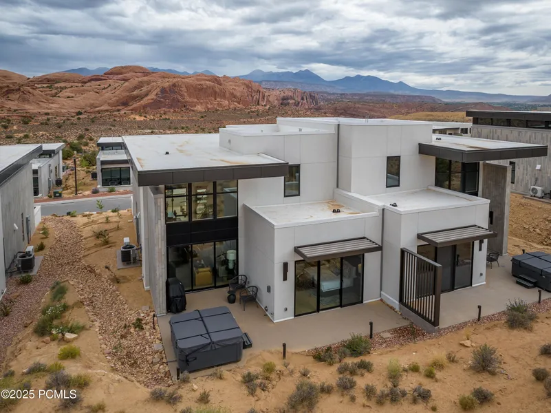 LIONSBACK RESORT - An unparalleled experience of discovery and respite. Designed to blend in with its natural landscape, Lionsback Resort offers an unrivaled launchpad for all the adventure, exploration and relaxation Moab has to offer, all while treading lightly on the land. While its 175 acres of land with 70% open space offer a sense of seclusion, Lionsback Resort is a stone's throw away from the City of Moab, so you're never far from community and culture. This timeless 2 story Strata Casita meets sophisticated design, immersing you in the surrounding desert landscape with both indoor and outdoor living. An abundance of large windows with vaulted ceilings gives you the unobstructed views of sunlight reflecting off red rock fins and the sunset alpenglow on the La Sal Mountains. Earthy desert hues from the Fireclay tile backsplash and Italian cabinets are beautifully offset by clean, modern lines from the timeless quartz countertops. Thoughtful design represents the surrounding terrain, all while incorporating high-end finishes, from Wolf and Subzero appliances to a 5-piece spa-like bathroom with wet room, soaking tub and Waterworks plumbing fixtures, to the built-in speaker system with Sonos amp. Offering 2 en suite bathrooms, this luxury home has short-term rental zoning and comes fully furnished and accessorized, including linens, decor, dishware, kitchen wares, televisions, and hot tub. When the wild terrain is calling, Lionsback Resort offers on-site access to the Mill Creek Trail and Hells Revenge 4x4 trail, standing at the gateway of the world-renowned Sand Flats Recreation Area, home of the famous Slickrock Trail, two National Parks, Arches and Canyonlands, and the Colorado River for limitless discovery.