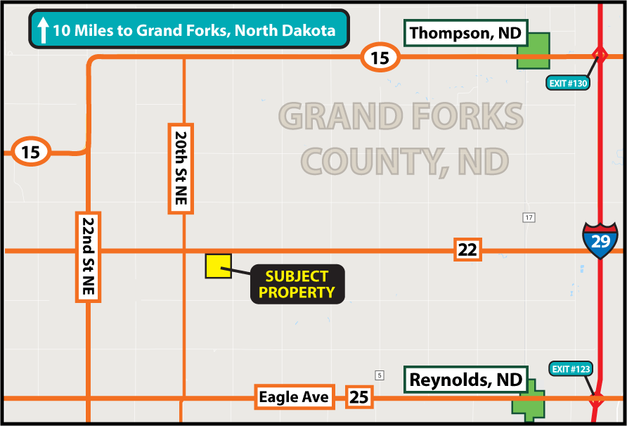 Research Parcel InformationDriving Directions: From Reynolds, ND go 7 miles west on County Rd #25 to 20th St N, then go north 3 miles, then 1mile east on County Rd 22/3rd Ave NE. This will bring you to the northeast corner of the property.