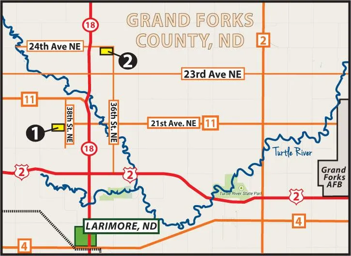 Driving Directions: From the intersection of US HWY #2 and ND #18 drive 2 miles north to 21st Ave NE. Then go 1 mile west on 21st Ave NE. This will bring you to the northeast corner of Parcel 1. From Parcel 1, continue north 3 miles to 24th Ave NE, then east mile this will bring you to the northwest corner of Parcel 2.