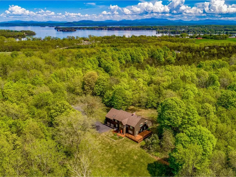 Don't miss out on this private getaway in South Hero nestled on 18 acres of woods and trails, and located less than 1 mile from Rockwell Bay. The exterior boasts both private woods and open lawn leading to a spring-fed pond, as well as a back patio and large wrap-around deck refinished in 2019. Inside, you'll find a beautiful chef's kitchen with Vermont slate countertops, gorgeous 9 foot island with an induction cook top, stainless steel appliances, GE Monogram wall oven, GE dual microwave/oven, double sinks, and walk-in pantry. Hardwood floors and new windows throughout the main floor provide an abundance of natural lighting. The warm and inviting living room features a wood fireplace with beautiful stone hearth and sliding doors that lead to a wrap-around deck - the perfect place to relax this summer. A half bath, rec room, and sizable formal dining room complete the first floor. Head upstairs to the primary bedroom with wood fireplace, custom walk-in closet, and tile bathroom with vaulted ceilings. Three guest bedrooms, a remodeled full bath, office space, plus three above-garage bonus rooms complete the second floor. There is plenty of room for everyone to stretch out with 4,600 sq. ft. of finished space! Efficient Runtal baseboard heaters, substantial insulation added into the attic, annual servicing of the boiler, newer roof, an additional heat pump in the newly finished workshop, and so much more can be found here. Don't miss out on this stunning home!