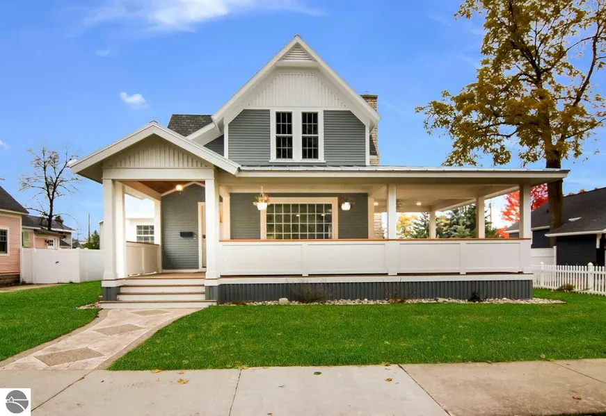 This craftsman style home has been updated throughout and is located off of highly desirable E State St in Traverse City. Highlights of the home include a beautiful wrap around porch, new siding, new windows, and roof just to name a few. The interior features a lovely foyer w/original staircase, completely remodeled main floor with a sitting room, living room, family room and dining room and 2 natural fireplaces. Three bedrooms on the main floor include a Master Suite with spacious closets and private bath with granite counter tops. The second floor could be a great in law suite featuring 2 bedrooms (one non conforming), kitchen and living area with separate heat and electric. Could also be used as a rental. See docs for complete list of updates.