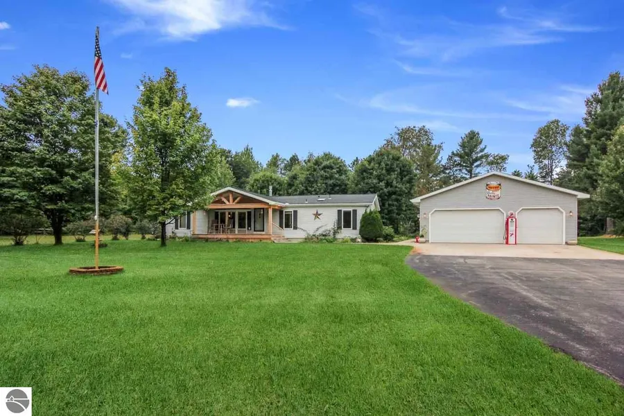 This is not your typical manufactured house...Meticulously maintained and well loved is the best way to describe this home. Completely updated with drywall throughout, windows, vented roof system, granite counter tops, solid oak, tile and carpeted floors, a gorgeous gas fireplace surrounded by natural stone, furnace with central air, water softener & a full unfinished basement with 9' walls. This beautiful house offers main floor living, with a spacious master bedroom boasting a large bathroom and walk in closet. There's 2 additional bedrooms on the opposite end with a shared bathroom & cozy family room.The detached 32 x 40 insulated & heated garage with built in cabinets and counter space offers plenty of room for all the toys. Enjoy time on the front covered porch or out back entertaining on the large deck. Just minutes from Interlochen and a short distance to Traverse City.