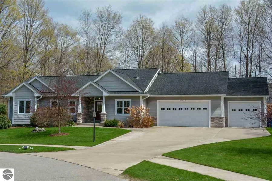 Elegant and meticulously maintained, this charming craftsman ranch in the Leelanau Highlands neighborhood is a must-see! This home comes fully outfitted with modern amenities and beautiful finishes. Features include bamboo and Brazilian hardwood floors, an airy kitchen area with quartz countertops, a formal dining area, and bright bathrooms with granite counters and porcelain flooring. The walk-out lower level has an additional gas fireplace, a fully outfitted home bar with concrete countertops, 9-foot ceilings, an additional bedroom with egress windows, and a full bath. Store your vehicles in the heated 32'x36 oversized car garage that can store up to 5 cars or 28' boat - features a vehicle washing system with water softener and high capacity drain system. Enjoy the well-kept and private landscaped yard from the patio (with primary bedroom access); fully irrigated with hot tub electrical hook-up ready to go. This home is only 8 miles from downtown Traverse City and surrounded by plenty of Northern Michigan activities and nature!