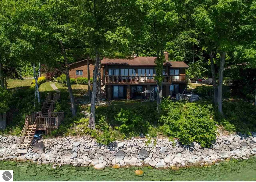 Stunning East Grand Traverse Bay waterfront home with 100' of private frontage! Relax in this wonderful seasonal or year-round Northern Michigan get-away nestled into a quiet, private corner of the coveted Old Mission Peninsula. Enjoy breath-taking sun-rises and vistas from the walk-out wooden decking, or step-down into the all-sports clear waters of the bay. This home features a timeless brick exterior and landscaping, and plenty of space for family and friends inside. The main floor has a formal foyer, step-down living room with a wood-burning fireplace, large windows and doors that overlook the waterfront, bay window dining room, an airy kitchen, and a primary bedroom with a private en-suite and balcony. The finished lower level has a roomy, walk-out den with an additional fireplace and a built-in bookshelf nook. There are also two bedrooms with doors to the lower patio and a newly re...