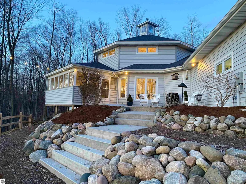 Custom Designed Old Mission Peninsula Luxury Living! This completely updated 5 bedroom 3.5 bathroom home features over 4,000 square feet of custom touches and fine attention to detail throughout. The estate-like setting, nestled into a vineyard, boasts 5 acres of rolling woodland. An entertainer's dream home! The tasteful open concept living space includes a dining area, gourmet kitchen and over 30' cathedral ceilings! Off of the main living area, a spiral staircase leads to a loft that provides vast vineyard views and solid glimpses of East Bay. Watch the sunrise over East Bay while you sip your coffee and then enjoy breathtaking sunsets over the vineyard with a glass of wine. The main level of the home features three large bedrooms and 2.5 bathrooms. The primary bedroom suite includes a grand spa bathroom with vaulted ceilings and a generous walk-in closet. From the primary bedroom cur...