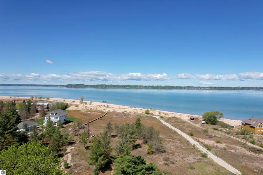 Stunning, sandy East Grand Traverse Bay beach waterfront! Enjoy summer days and nights on your own 123' of sandy beach and experience beautiful sunsets and a gorgeous vista of Old Mission Peninsula. The property transforms from a hardwood forest to the sands of the beach as you traverse through the lot. Includes a 800 sq ft A-frame built in 1964 with two bedrooms, one bath, and a full kitchen. The house has been meticulously kept and is great for a quiet Up-North getaway. There is also an additional small building with bunks for sleeping and a garden shed. This lot is perfect for any new build to create your own cottage, year-round home, family compound, or many other possibilities! Only a 20 minute drive from Traverse City and a 5 minute drive from all the amenities of Elk Rapids!