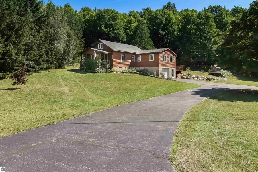 Exceptional east side setting for this beautifully updated home. Situated on just over 2 acres with surrounding wooded privacy and a very convenient Traverse City location. High end custom updates throughout including a modern and elegant kitchen with marble countertops, Viking six burner gas range, farm sink and built in coffee bar, private primary bedroom suite with spa like private bath, wood and cork flooring finishes, wrought iron railing designs and so much more. Finished lower level adds additional living or recreation space to enjoy. Cozy covered front porch along with an expansive deck provides room to enjoy the outdoors and a relaxing outdoor shower. Plenty of room for a future outbuilding on property. Superb location and setting.
