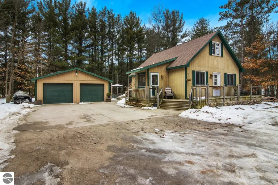 Charming 2-bedroom, 1-bathroom, 1.5-story home nestled on a spacious 2.5-acre wooded lot, and conveniently situated just 25 minutes from Downtown Traverse City and West Bay. The inside of the house features a mudroom and a main-level primary bedroom as well as a generously sized bathroom. Upstairs you'll find the second bedroom. Going downstairs you'll find a mostly finished basement equipped with knotty pine tongue and groove walls and a large laundry room. Within the last 3 years, some of the updates to the home include a new washer and dryer, water heater, and kitchen stove. Just off the back deck of the home, you will find a 21'x18' patio ready to be enjoyed. Also just outside the home is an insulated 32'x24' detached garage with a wood-burning stove, a 220 amp electrical service, and another 14'x10' storage shed just behind it. Not only does the garage offer a place to park your veh...