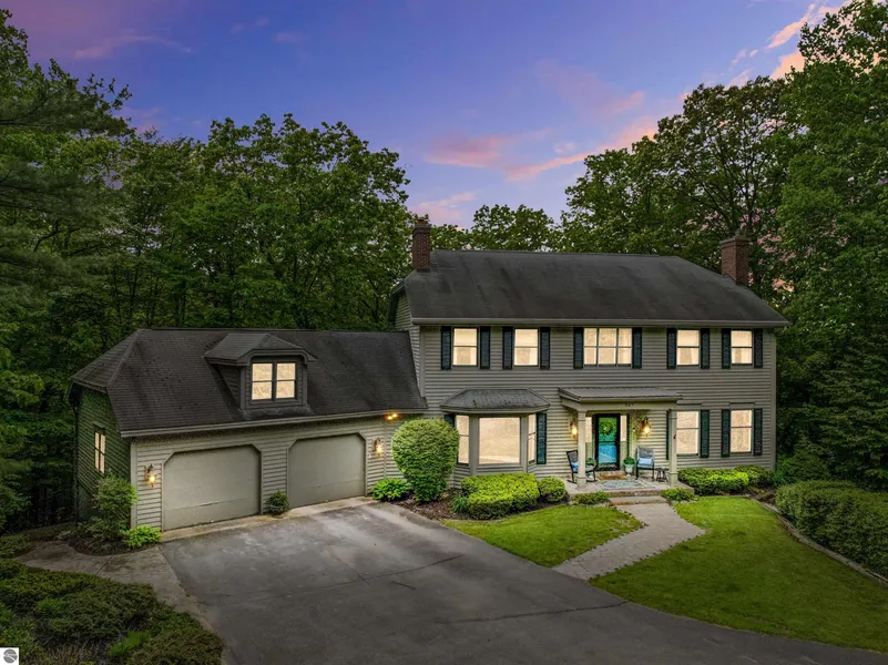 Welcome to your dream home on Old Mission Peninsula. Located at the end of a tranquil private drive in the distinguished Logan Hills neighborhood. This exquisite residence has 4085 finished square feet of meticulously crafted living space, perfectly situated on a sprawling 1.62-acre lot with breathtaking seasonal views of West Grand Traverse Bay. As you step inside, you're greeted by the warmth of hardwood floors leading you through an inviting foyer into the heart of the home. The main level features a stunning gourmet kitchen, complete with top-of-the-line appliances, custom cabinetry, and a center island, making it a chef's delight. Adjacent is a formal dining room, ideal for hosting memorable gatherings and intimate dinners alike. Relax and unwind in one of three elegant firelit living areas, each offering its own unique ambiance and charm. Whether you're enjoying a quiet evening curled up with a book or entertaining guests, these cozy spaces provide the perfect backdrop for every occasion.The main level also boasts a private office, providing a serene retreat for work or study, while three spacious bedrooms each offer their own private ensuite bathroom, ensuring comfort and convenience for everyone in the household. For additional living space, the full finished lower level features a walkout, providing seamless access to the lush outdoors. Here, you'll find a fourth bedroom, with a full bathroom, perfect for guests or as a secluded sanctuary. Outside, the expansive yard offers endless possibilities for outdoor enjoyment, from tranquil mornings sipping coffee on the composite rear deck to lively gatherings under the stars. Your opportunity to experience luxury living at its finest in this remarkable home with its unmatched blend of elegance, comfort, and privacy. Discover the lifestyle you've been dreaming of.
