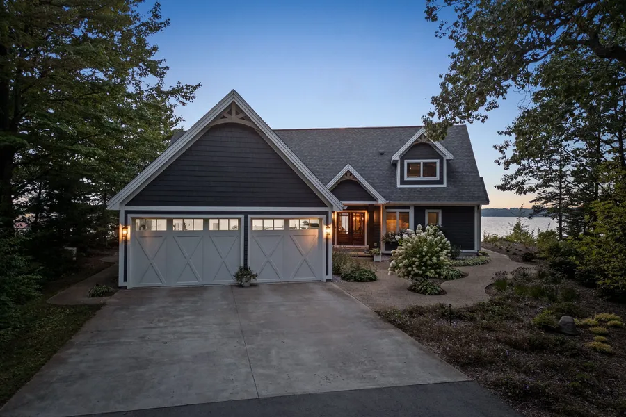 Discover the pinnacle of lakeside luxury in this exquisite East Grand Traverse Bay residence, just 6 miles from the vibrant heart of Downtown Traverse City. This stunning property boasts unparalleled panoramic views, breathtaking sunsets, and the rare luxury of your own private sandy shoreline. The waist-deep, hard-packed sand invites you to enjoy serene days on the water, while the expansive custom patio, complete with a fire pit, offers the perfect setting for entertaining or relaxing with loved ones. The meticulously landscaped grounds provide both beauty and seclusion, creating a peaceful retreat surrounded by nature. Located over 1,000 feet from the main road on the exclusive Kay Ray—a no-outlet road—this home offers the utmost privacy and tranquility. Step inside to find a true "Up North" escape, where soaring cathedral ceilings and floor-to-ceiling windows frame the magnificent vi...