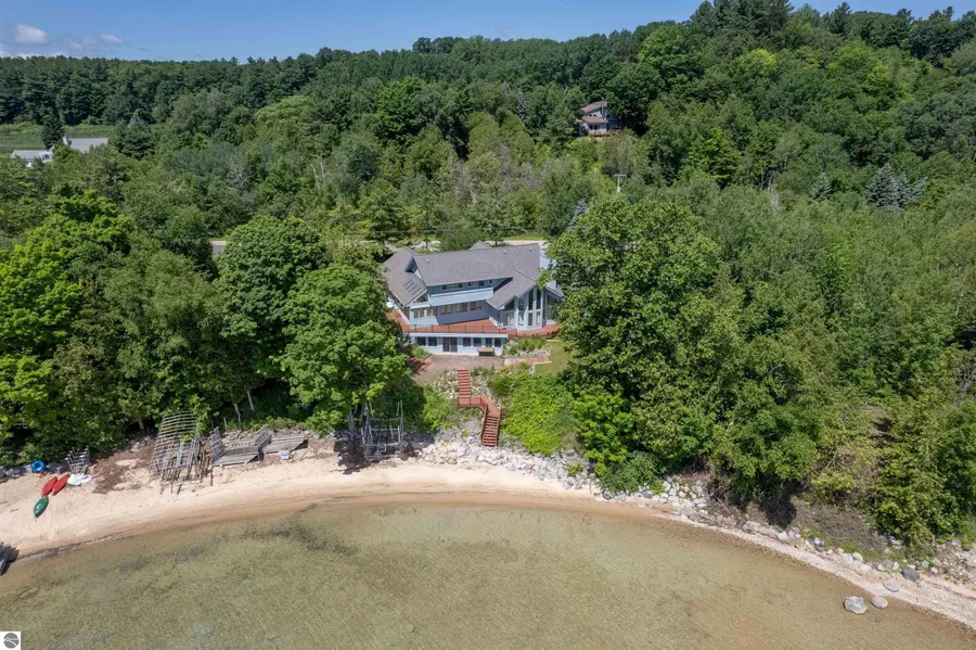 Discover an exceptional waterfront property on Old Mission Peninsula, boasting over 202' of pristine sandy shoreline along East Grand Traverse Bay. This premium beachfront offers the perfect setting for endless summer activities. Launch your kayak, paddleboard, or boat directly from your private beach, or simply dive into the crystal-clear waters for a refreshing swim in the bay. The property encompasses two generous lots in an exclusive location on prestigious Bluff Road, offering unparalleled privacy & tranquility. Experience breathtaking sunrise & moonrise views over the water from your multi-level decking system, thoughtfully designed with stairs leading directly to your private beach sanctuary. The expansive yard provides ample space for outdoor entertainment and activities. Vehicle storage is well-accommodated with an attached two-car garage plus an additional 2.5-car garage for ex...