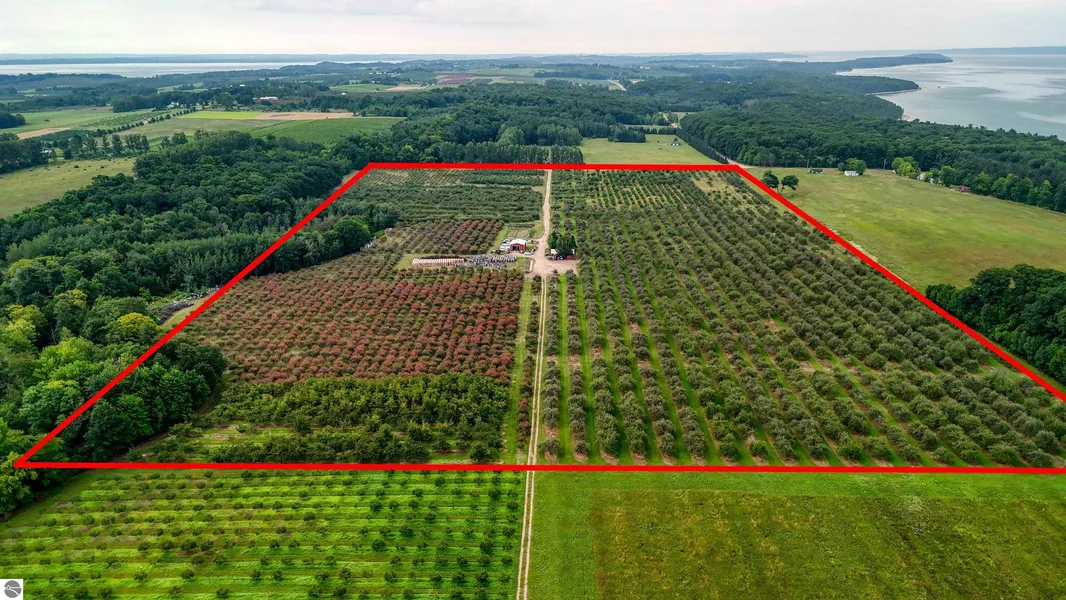 Old Mission Peninsula fully operating 68-acre fruit farm with 2025 apple & cherry production now underway! The orchard features multiple varieties of apples on 46 acres, 12 acres of cherries (3 sweet, 9 sour), and two 30 X 40 outbuildings. The entire parcel has trickle irrigation; 2 emitters on each apple tree, 1 on the cherry, anchored by a 100 gallon per minute water well. The property is in the Grand Traverse Land Conservancy; one home building site is allowed. The owner is retiring, this is a once in a lifetime opportunity to own the farm of your dreams.