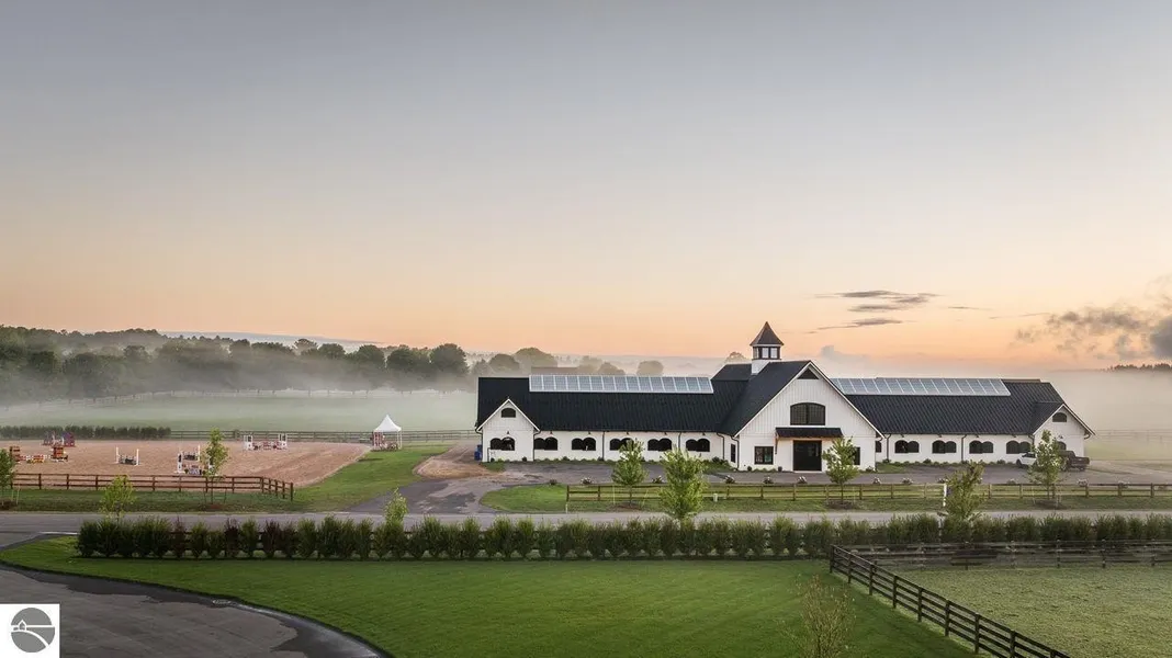 Luxury equestrian facility in Grand Prix Village North, Northern Michigan’s premier gated equestrian community. This recently completed 10,858 sq ft custom barn by B&D Builders sits on a high-visibility lot with direct access to Flintfields Horse Park via private bridle paths, while still offering the privacy and security of a gated setting. The barn includes 22 stalls, 4 wash stalls, 4 grooming stalls, feed room, hay storage, laundry room, bathroom, and office. A separate three-car garage includes a well equipped 4-bedroom, 2-bathroom apartment above, perfect for staff or guest accommodations. (Skylights will be installed on the barn in mid-July) The property is fully fenced and professionally landscaped, featuring a 185' x 175' riding arena with an ebb-and-flow watering system and four 60' x 60' fenced paddocks. Grand Prix Village North was designed by equestrians to support a premi...