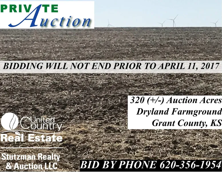 320+/- Acres of Farmland Available by Private Auction. Contact United Country Stutzman Realty & Auction, LLC in Ulysses, KS. Office (620)356-1954 or Jerry Stutzman Mobile (620)353-9411 or Tobias Stutzman Mobile (620)952-1478. This 320+/- Acre tract of dryland farmground is located in northeast Grant County, KS. Legal is the W/2 of 23-27-35 Grant County, KS. This tract of land is open. Possession will be immediate and upon closing. Call today to inquire or place a bid!