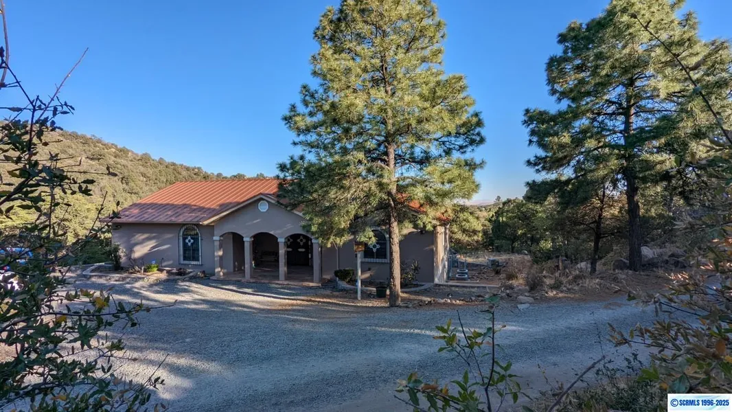 Solar dream home offers seclusion and amazing craftmanship on this open floor plan layout. 400 amp service, 27 solar panel installation, Generac whole home back-up generator, all on almost 7 acres bordering BLM. Nestled in the ponderosa, oak, and pines, this home boasts 10-14 ft vaulted ceilings, a Chef's dream kitchen with large granite prep island and custom cabinetry. The primary bedroom is as big as some homes, including an office and craft/art space. The main level can serve as single level living with two bedrooms, one currently used as a home theater. Downstairs is a fully equipped 1200 sq/ft apartment with separate entrance. Only four owners use this dead end road. The 2000 sq/ft shop with 10' ceilings and solid 12' reinforced concrete walls has been drywalled and is ready to suit your needs, including already being ducted for A/C and Heat. Custom arches adorn this light filled home, outdoor Trex deck provides 10 views!