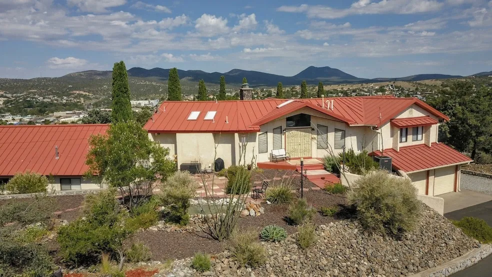 Beautiful hillside custom home! This 5 bedroom, 3 bath home is an impeccably designed mid-century style gem, overlooking the town of Silver City, while offering an amazing amount of privacy. Light-filled rooms with Mountain Views, Built-in Bookcases, Custom Stone Fireplaces, Formal Dining Room and a sleek, Modernized Kitchen with Granite Countertops and Stainless Appliances. The primary suite boasts an oversized bathroom with a double vanity plus a walk-in shower. Amenities include: Seamless Metal Roof, Tankless Water Heater, A/C and evaporative cooling, enclosed garages for 4 vehicles, workshop with restroom, gas fireplace inserts, hot tub, remote front gate, video surveillance system, 220v in shop and more. The lower level features a full kitchen, family room, a large home office/bedroom, two more guest bedrooms and full bathroom, making a perfect place to accommodate extended family.