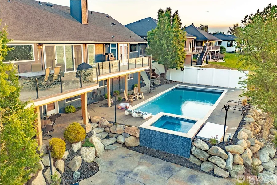 Phenomenal lakefront property w/every luxurious upgrade! This property has been remodeled top to bottom, curb to bulkhead, into the most modern & comfortable 3,400+ sq ft home on Moses Lake. Enjoy natural light & endless water views from the floor to ceiling windows & double open sliding glass door in the open living room & kitchen. Thermador range, custom cabinetry, quartz countertops, touchless faucets & baking suite exude a rich comfort. Primary suite on the main boasts a glass enclosed shower, heater towel racks & expansive closet. The daylight basement hosts 2 bedrooms, open living space, secondary kitchen & easy walkout to the 18'x36' in-ground pool & spa. 86'+/- of waterfront w/hydro/solar lift, firepit all made for entertaining!