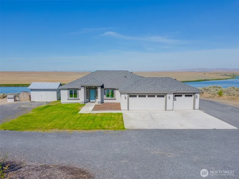 Experience peaceful living with breathtaking views & year round sunsets on 3 plus acres w/Lake access. This 3 bdrm/2 bath well appointed home offers modern amenities, ample space and the perfect blend of nature. A welcoming entry invites you in. Vaulted ceilings in the kitchen, den & living areas. Large kitchen island w/undermount sink, under cabinet lighting, Huntwood soft close cabinets, pantry and Quartz countertops throughout. Stainless steel appliances including propane stove & Samsung smart fridge w/touchscreen. Dining nook w/Lake views. Primary en-suite with walk in closet, luxurious bathroom, double sinks, soft close cabinets, oversized aromatherapy shower. Electrical conduit in place for future shops. So much more!
