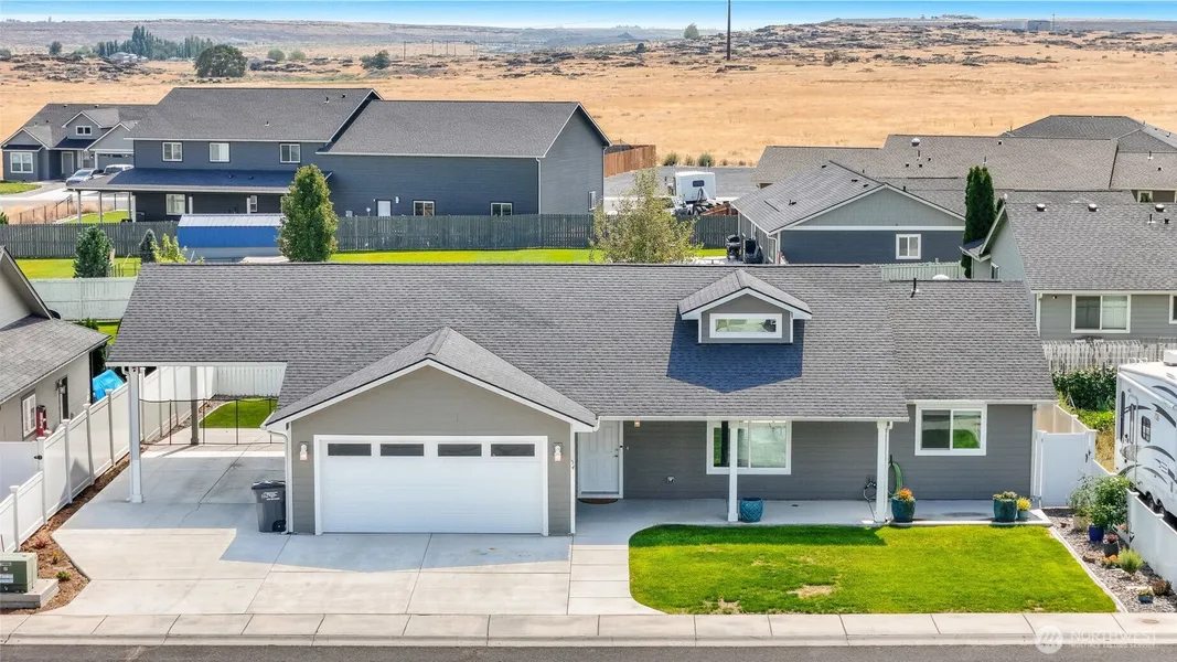 Move-in ready 2020 home featuring 3 bedrooms, 2 bathrooms, and a spacious open-concept floor plan. The stunning kitchen is a true highlight with white quartz countertops, stainless steel appliances, soft-close cabinets, a large island with bar seating, and a pantry - perfect for cooking and entertaining. The great room offers plenty of natural light with modern, neutral finishes throughout the home. Step outside to a fenced backyard with a covered patio, ideal for outdoor living. The yard is fully landscaped with front and back underground sprinklers and curbing for easy care. A painted and insulated garage adds comfort and storage, while the carport covered RV parking with 50-amp service makes this property a rare find.