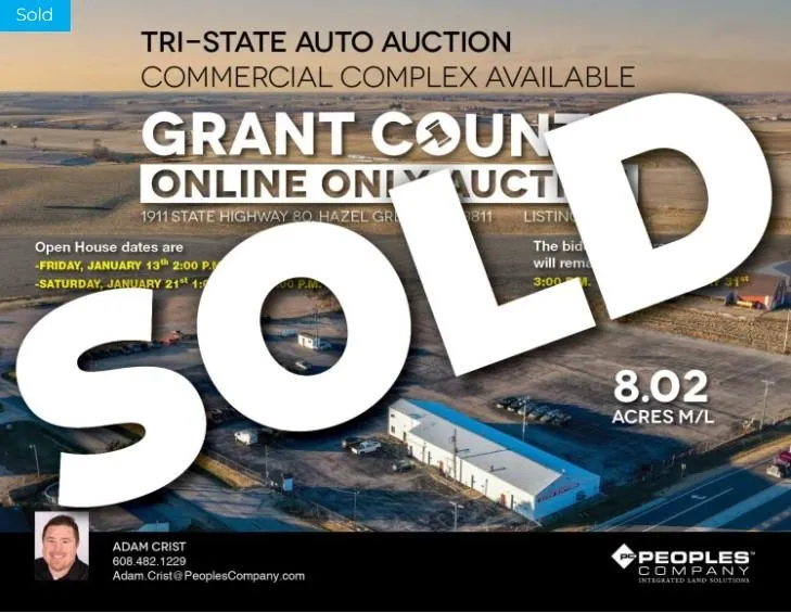 Peoples Company is pleased to be representing the sale and Online Only Auction of the Tri-State Auto Auction commercial complex located four miles south of Cuba City, Wisconsin. The Brogley family has been a staple in the auto auction business for over 70 years and still holds the coveted Dealer License No. 1 in the state of Wisconsin. The land is comprised of 8.023 taxable acres with an improved 6,888 sq. ft. insulated and heated building with 2,208 sq. ft. of office space. This commercial site offers an abundance of opportunities with great access and visibility along State Highway 80 and State Highway 11.