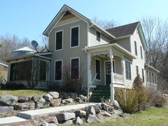 Country estate in beautiful southwest Wisconsin with classic farm home featuring original wood floors throughout. A spacious, screened, wrap-around porch extends the living space. Built in carriage house style in 1996, the garage has attractive living quarters with 768 square feet on the second floor - a perfect guest house. Several other buildings, all in good condition, includes a large machine shed, an older dairy barn, grain bins and more. Good access on seal coated road from County T. Mostly wooded.