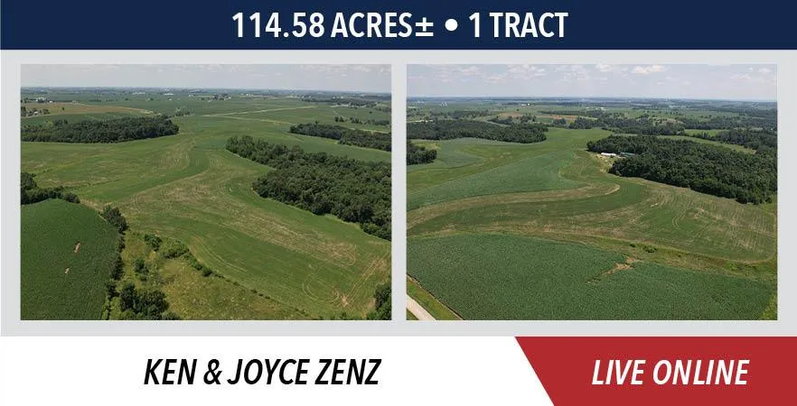 The Zenz farm will be sold on a price per acre basis, based on taxable acres. Immediately following the auction, the successful buyer will be required to sign a real estate sales contract and pay ten percent (10%) of the purchase price as a non-refundable down payment which will be held in escrow until closing. The balance of the purchase price will be due at closing which will take place on or before October 16, 2025.