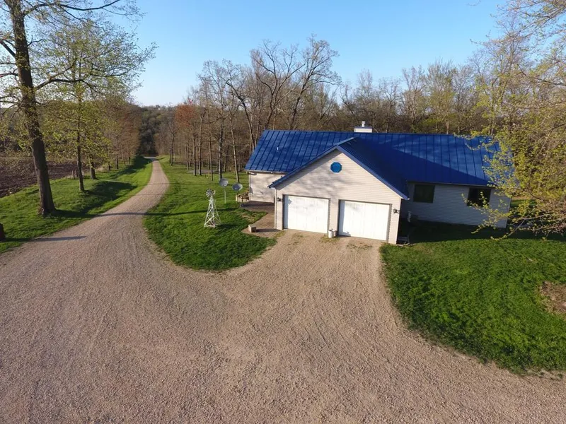 Country home on 26.5+/- wooded acres features a metal roof, cathedral ceilings, a fireplace and a large deck. The main floor master suite is privately located away from the other 3 bedrooms and a second full bath. Currently, one of the bedrooms is configured as a laundry room. The lower level of the home is exposed with a walkout to the yard. The 5th bedroom, a half bath, a large family room, laundry room and a bonus room are on this level. An outdoor wood furnace lowers the heating bill. Outbuildings include a detached garage with upstairs storage, a car port, and several small buildings. *septic is sized for 3 bedroom house
