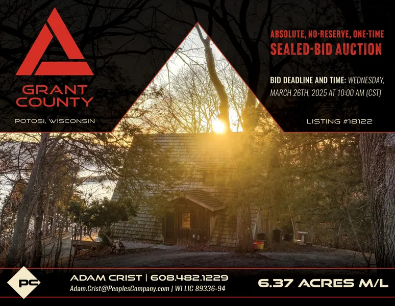 Mark your calendar for an unparalleled opportunity to own a stunning residential property in Grant County, Wisconsin, available through an Absolute, No-Reserve, One-Time Sealed-Bid Auction on Wednesday, March 26, 2025. Peoples Company is excited to present this extraordinary home, perched above the majestic Mississippi River, offering sweeping million-dollar views from the living room, back deck, and expansive backyard. Currently operating as a highly successful Airbnb, the property has generated over $20,000 annually, making it a fantastic turnkey investment with immediate earning potential.